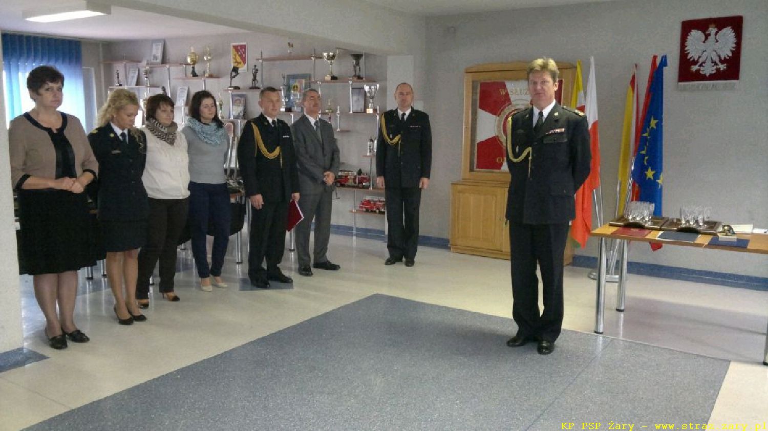 Uroczysty Apel z okazji Święta Niepodległości, Żary - 16 listopada 2012 r. W dniu 16 listopada 2012 r. w Komendzie Powiatowej Państwowej Straży Pożarnej w Żarach odbył się uroczysty apel, podczas którego bryg. Dariusz Łoś - Komendant Powiatowy Państwowej Straży Pożarnej w Żarach wręczył wyróżniającym się strażakom awanse na wyższe stopnie służbowe. Wyróżnieni zostali następujący strażacy KP PSP w Żarach. Minister Spraw Wewnętrznych Rozkazem Personalnym Nr 109 z dnia