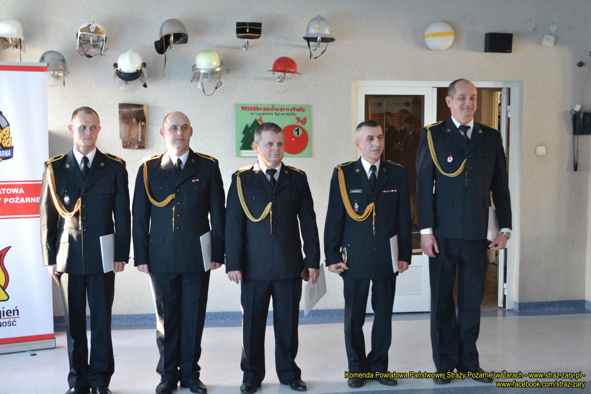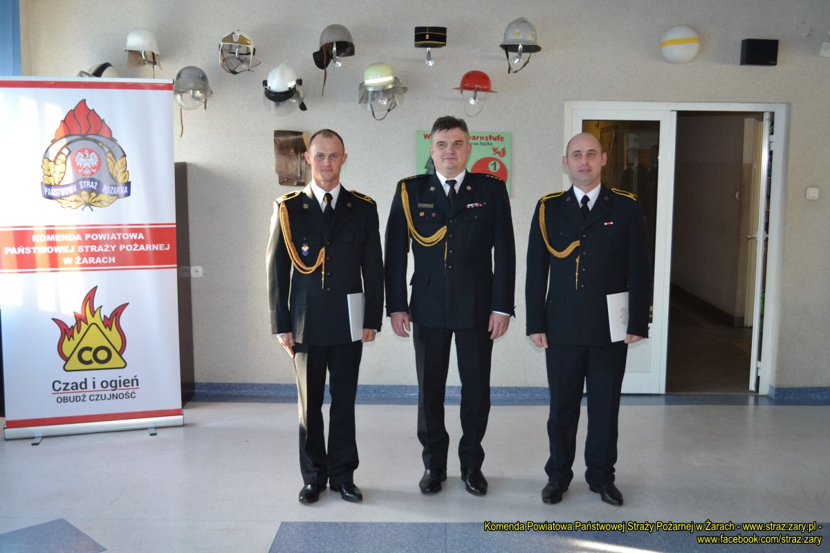 Uroczysta Zbiórka w Komendzie Powiatowej PSP w Żarach - 30 grudnia 2016 r. Z okazji kończącego się roku, w dniu 30 grudnia 2016 roku w Komendzie Powiatowej PSP w Żarach odbyła się uroczysta zbiórka. Podczas spotkania st. kpt. Robert Słowikowski Komendant Powiatowy PSP w Żarach wręczył akt nominacyjny na wyższe stanowisko służbowe, przyznane wyróżnienia oraz uroczyście pożegnał funkcjonariuszy przechodzących na zaopatrzenie emerytalne. Komendant Powiatowy PSP w Żarach st. kpt. Robert Słowikowski mianował z dniem 1 stycznia 2017 roku na wyższe stanowisko służbowe: Dowódcy Zastępu – mł. asp. Rafała DRAJERA Komendant Powiatowy Państwowej Straży Pożarnej w Żarach, mając na uwadze potrzebę zapewnienia prawidłowego funkcjonowania Komendy, z dniem 1 stycznia 2017 roku rozszerzył zakres czynności o zadania: Dowódcy Zastępu - ogn. Łukaszowi MAGRYNOWI Komendant Powiatowy Państwowej Straży Pożarnej w Żarach zwolnił ze służby w Państwowej Straży Pożarnej: z dniem 30 listopada