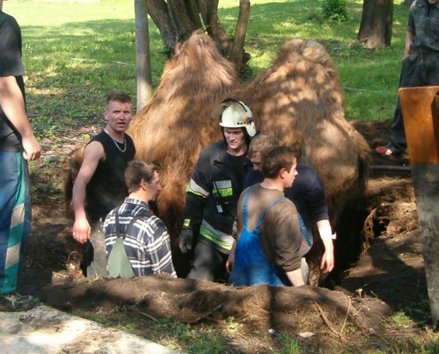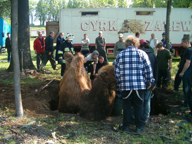 Ratujemy wielbłąda - Żary 16.05.2005 r. W dniu 16 maja 2005 r. strażacy z Jednostki Ratowniczo - Gaśniczej PSP w Żarach ratowali wielbłąda. Do tego niecodziennego zdarzenia doszło podczas wizyty w Żarach cyrku. Wybieg dla wielbłąda zorganizowano w miejscu w którym znajdował się przykryty betonowymi płytami kanał. Pod ciężarem wielbłąda płyty załamały się a wielbłąd utknął w otworze.
