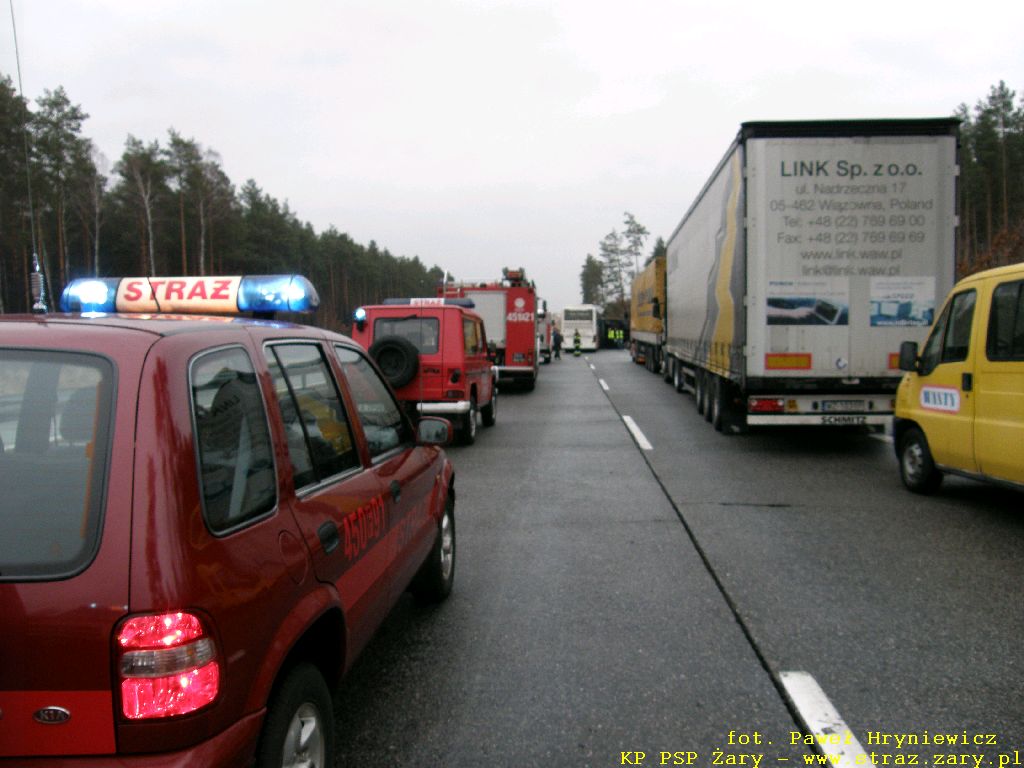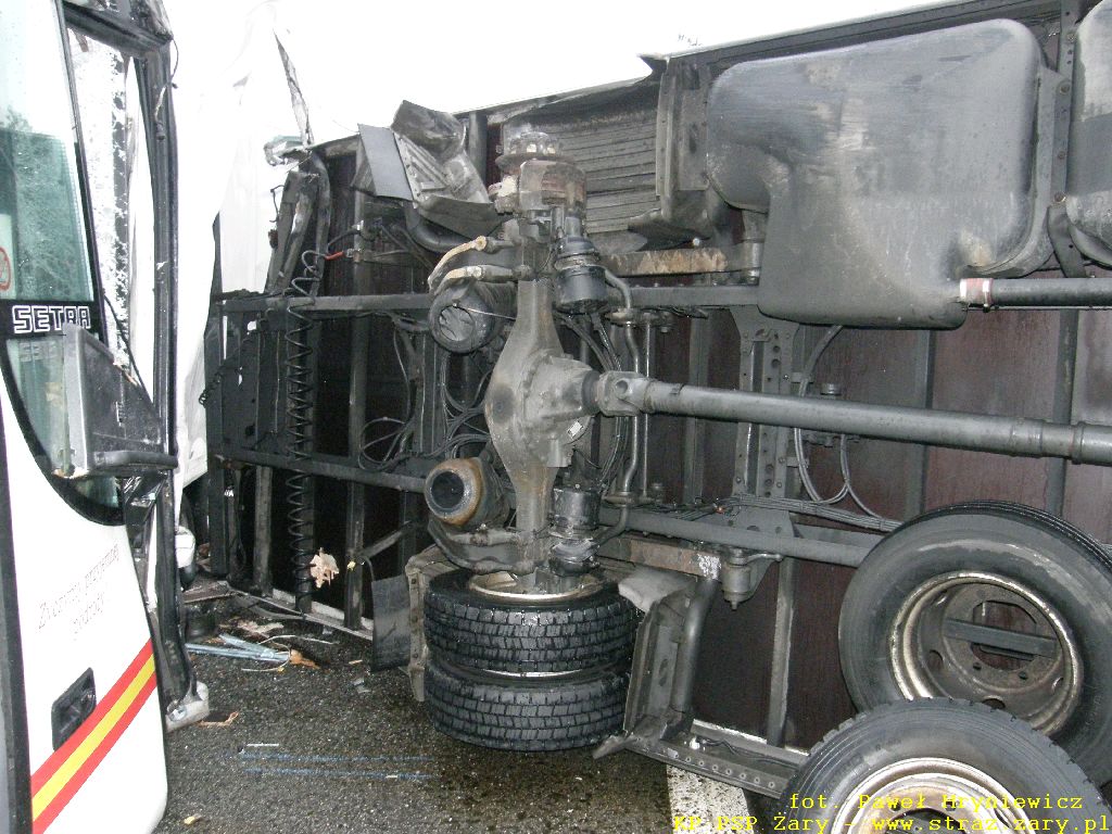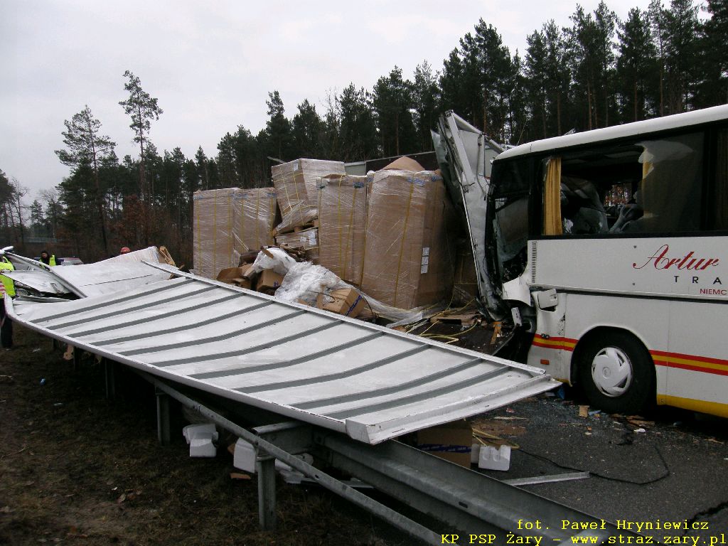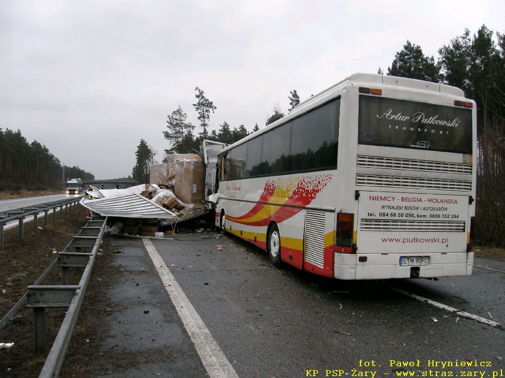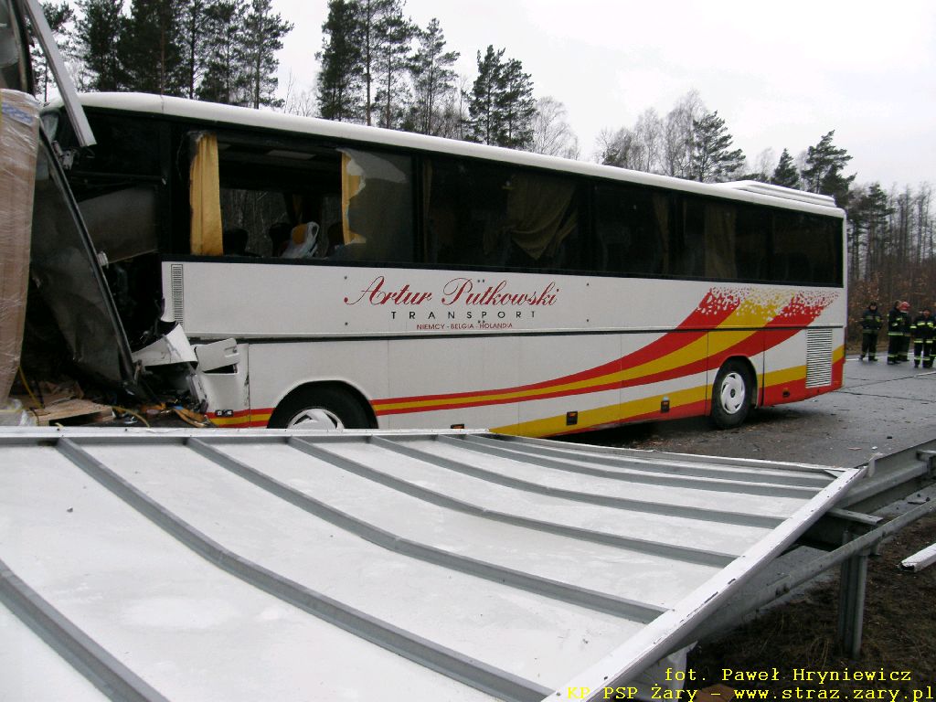 Wypadek autokaru z samochodem ciężarowym - Droga Krajowa nr18 - 23 lutego 2012 r. W dniach 23 lutego 2012 r. na drodze krajowej nr 18 relacji Olszyna - Wrocław doszło do groźnego w skutkach wypadku. Autokar przewożący 16 pasażerów uderzył w tył przyczepy samochodu ciężarowego który stał z powodu awarii na lewym pasie drogi. W wyniku zdarzenia wszyscy pasażerowie oraz kierowca autobusu doznali obrażeń i zostali przewiezieni do szpitali. działania zastępów straży pożarnej polegały na wykonaniu dostępu i ewakuacji kierowcy autokaru i pasażerów oraz usunieciu rozbitych pojazdów z drogi.