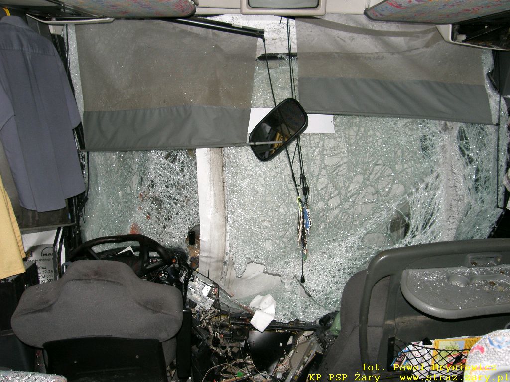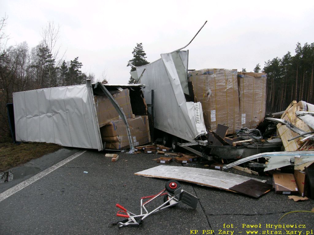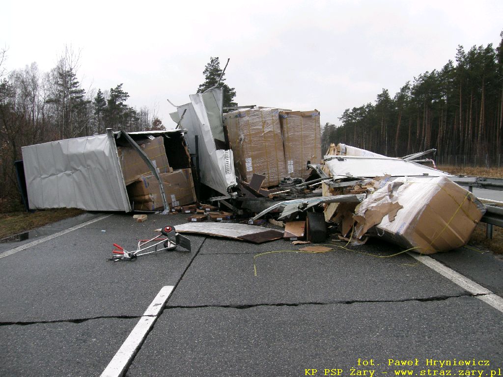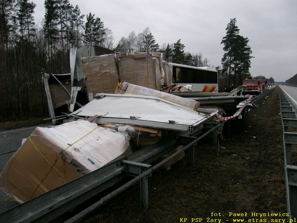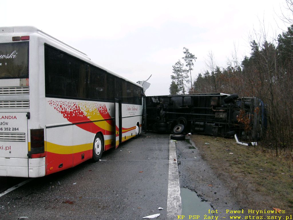 Wypadek autokaru z samochodem ciężarowym - Droga Krajowa nr18 - 23 lutego 2012 r. W dniach 23 lutego 2012 r. na drodze krajowej nr 18 relacji Olszyna - Wrocław doszło do groźnego w skutkach wypadku. Autokar przewożący 16 pasażerów uderzył w tył przyczepy samochodu ciężarowego który stał z powodu awarii na lewym pasie drogi. W wyniku zdarzenia wszyscy pasażerowie oraz kierowca autobusu doznali obrażeń i zostali przewiezieni do szpitali. działania zastępów straży pożarnej polegały na wykonaniu dostępu i ewakuacji kierowcy autokaru i pasażerów oraz usunieciu rozbitych pojazdów z drogi.